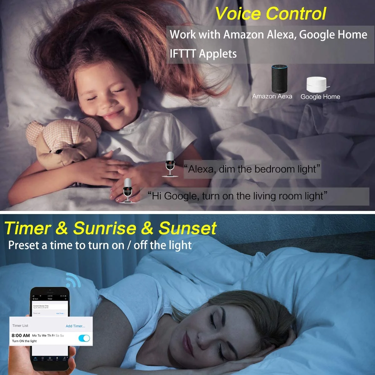 Easy to Use - These smart controllers for lights could be used on many different types of 3528 5050 2835 RGB led strip lights, also one or two strip lights kits. Comes with a Wifi controller and a mini IR remote and a little 4 pin connector. you can control many light strips at the same time with the sync control and remote control the lights by Internet anywhere. The timer function enables you to set a time and wake up with your favorite color.